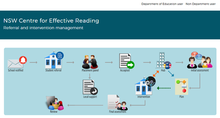 The NSW Centre for Effective Reading (NSW CER) Referral and Intervention Management system manages the student referrals from eligible NSW schools. The system also manages the intervention and support processes for students who receive a direct service from the NSW CER.